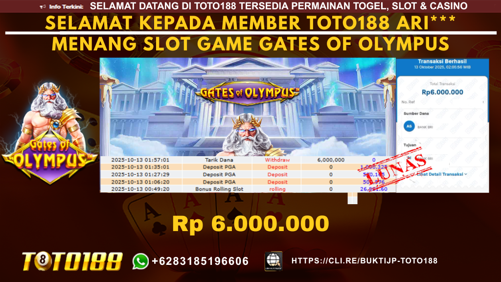 TOTO188 adalah situs terpercaya untuk Togel, Live Casino, dan Slot Online di Indonesia. Dengan satu ID, mainkan berbagai permainan dan menangkan besar. Kami menjamin pembayaran penuh untuk setiap kemenangan Anda. Nikmati juga promosi menarik dan deposit minimal hanya Rp. 10.000. Bergabunglah sekarang di JACKPOT IDN LIVE TOTO188  untuk pengalaman bermain yang aman dan menguntungkan. Berikut adalah BUKTI KEMENANGAN MEMBER di TOTO188  : Selamat kepada pengguna ID ARI*** yang baru saja memenangkan Rp. 6.000.000,-  dalam Permainan SLOT GAME GATES OF OLYMPUS Kami proses dan bayar 100% kemenangan dengan cepat, hanya dalam 3-5 menit. Bukti pembayaran kami adalah bukti kemenangan member, jaminan kejujuran dan transparansi TOTO188. Jangan lewatkan kesempatan untuk bergabung dengan kami di TOTO188, tempat di mana kemenangan besar menanti Anda.BONUS PROMO TOTO188 :