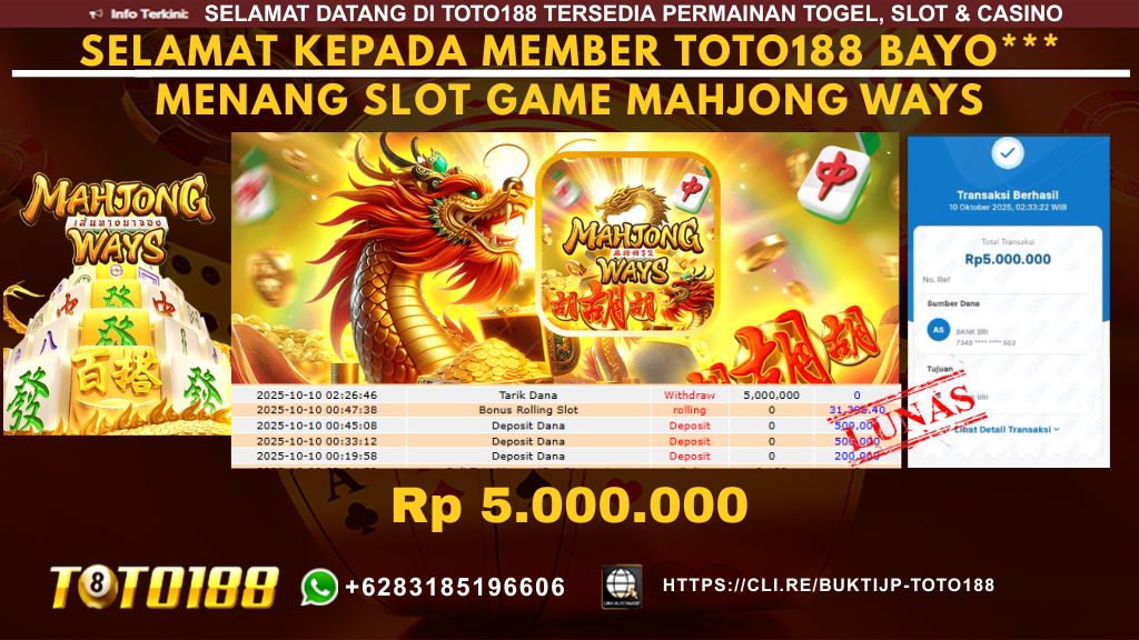 TOTO188 adalah situs terpercaya untuk Togel, Live Casino, dan Slot Online di Indonesia. Dengan satu ID, mainkan berbagai permainan dan menangkan besar. Kami menjamin pembayaran penuh untuk setiap kemenangan Anda. Nikmati juga promosi menarik dan deposit minimal hanya Rp. 10.000. Bergabunglah sekarang di JACKPOT IDN LIVE TOTO188 untuk pengalaman bermain yang aman dan menguntungkan. Berikut adalah BUKTI KEMENANGAN MEMBER di TOTO188 : Selamat kepada pengguna ID BAYO*** yang baru saja memenangkan Rp. 5.000.000,- dalam Permainan SLOT GAME MAHJONG WAYS Kami proses dan bayar 100% kemenangan dengan cepat, hanya dalam 3-5 menit. Bukti pembayaran kami adalah bukti kemenangan member, jaminan kejujuran dan transparansi TOTO188. Jangan lewatkan kesempatan untuk bergabung dengan kami di TOTO188, tempat di mana kemenangan besar menanti Anda.