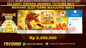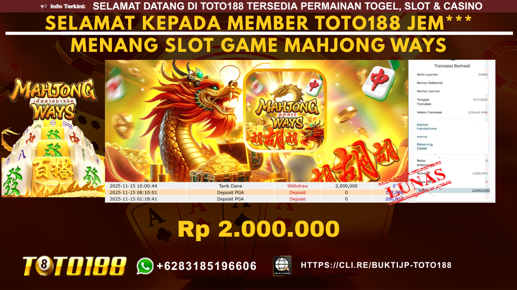 TOTO188 adalah situs terpercaya untuk Togel, Live Casino, dan Slot Online di Indonesia. Dengan satu ID, mainkan berbagai permainan dan menangkan besar. Kami menjamin pembayaran penuh untuk setiap kemenangan Anda. Nikmati juga promosi menarik dan deposit minimal hanya Rp. 10.000. Bergabunglah sekarang di JACKPOT IDN LIVE TOTO188  untuk pengalaman bermain yang aman dan menguntungkan. Berikut adalah BUKTI KEMENANGAN MEMBER di TOTO188  : Selamat kepada pengguna ID JEM*** yang baru saja memenangkan Rp. 2.000.000,-  dalam Permainan SLOT MAHJONG WAYS Kami proses dan bayar 100% kemenangan dengan cepat, hanya dalam 3-5 menit. Bukti pembayaran kami adalah bukti kemenangan member, jaminan kejujuran dan transparansi TOTO188. Jangan lewatkan kesempatan untuk bergabung dengan kami di TOTO188, tempat di mana kemenangan besar menanti Anda.BONUS PROMO TOTO188 :