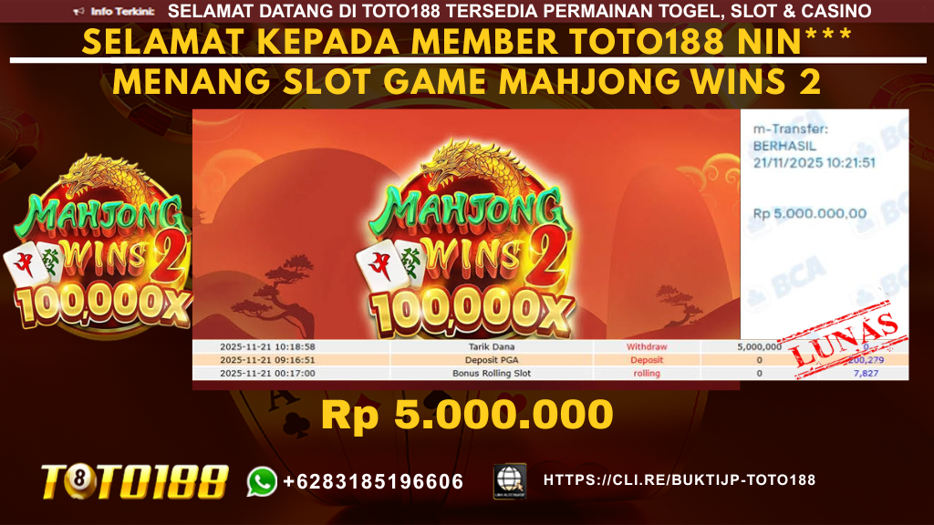 TOTO188 adalah situs terpercaya untuk Togel, Live Casino, dan Slot Online di Indonesia. Dengan satu ID, mainkan berbagai permainan dan menangkan besar. Kami menjamin pembayaran penuh untuk setiap kemenangan Anda. Nikmati juga promosi menarik dan deposit minimal hanya Rp. 10.000. Bergabunglah sekarang di JACKPOT IDN LIVE TOTO188  untuk pengalaman bermain yang aman dan menguntungkan. Berikut adalah BUKTI KEMENANGAN MEMBER di TOTO188  : Selamat kepada pengguna ID NIN*** yang baru saja memenangkan Rp. 5.000.000,-  dalam Permainan SLOT MAHJONG WINS 2  Kami proses dan bayar 100% kemenangan dengan cepat, hanya dalam 3-5 menit. Bukti pembayaran kami adalah bukti kemenangan member, jaminan kejujuran dan transparansi TOTO188. Jangan lewatkan kesempatan untuk bergabung dengan kami di TOTO188, tempat di mana kemenangan besar menanti Anda.BONUS PROMO TOTO188 :