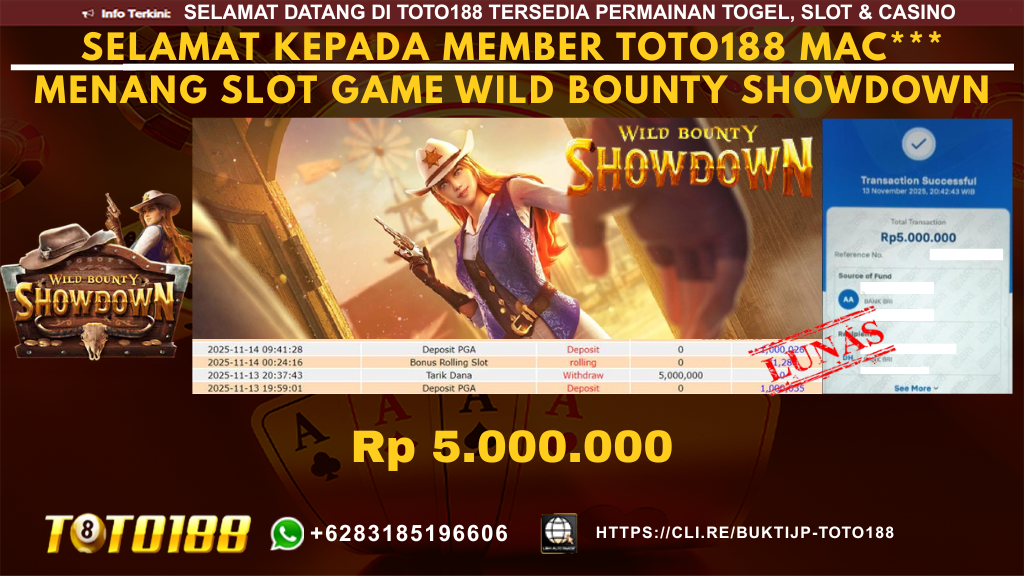 TOTO188 adalah situs terpercaya untuk Togel, Live Casino, dan Slot Online di Indonesia. Dengan satu ID, mainkan berbagai permainan dan menangkan besar. Kami menjamin pembayaran penuh untuk setiap kemenangan Anda. Nikmati juga promosi menarik dan deposit minimal hanya Rp. 10.000. Bergabunglah sekarang di JACKPOT IDN LIVE TOTO188  untuk pengalaman bermain yang aman dan menguntungkan. Berikut adalah BUKTI KEMENANGAN MEMBER di TOTO188  : Selamat kepada pengguna ID MAC*** yang baru saja memenangkan Rp. 5.000.000,-  dalam Permainan SLOT WILD BOUNTY SHOWDOWN Kami proses dan bayar 100% kemenangan dengan cepat, hanya dalam 3-5 menit. Bukti pembayaran kami adalah bukti kemenangan member, jaminan kejujuran dan transparansi TOTO188. Jangan lewatkan kesempatan untuk bergabung dengan kami di TOTO188, tempat di mana kemenangan besar menanti Anda.BONUS PROMO TOTO188 :