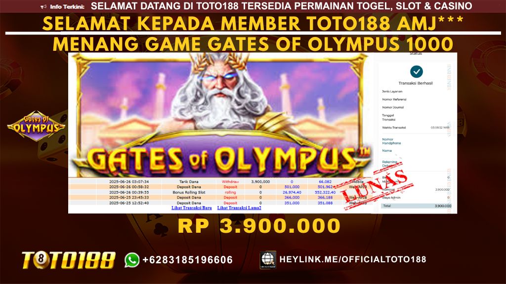 Bukti Kemenangan SLOT GAME GATES OF OLYMPUS 1000 Tanggal 26 JUNI 2025